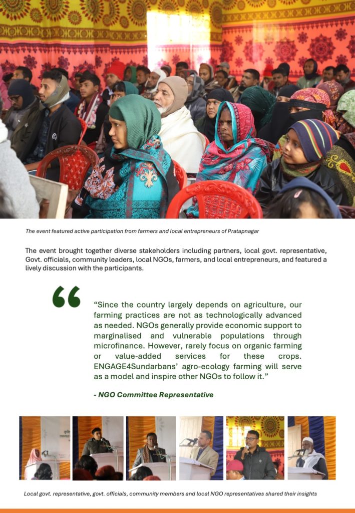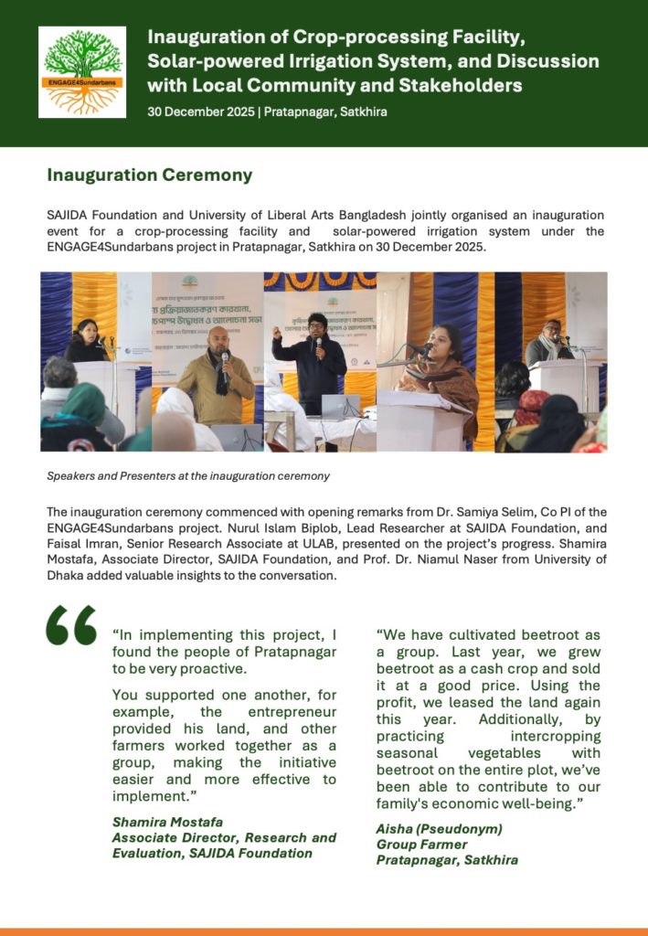 SAJIDA Foundation and the University of Liberal Arts Bangladesh jointly organised an inauguration event for a crop-processing facility and a solar-powered irrigation system under the ENGAGE4Sundarbans project in Pratapnagar, Satkhira, on 30 December 2025, attended by the local community, government officials, NGO representatives, and other stakeholders.